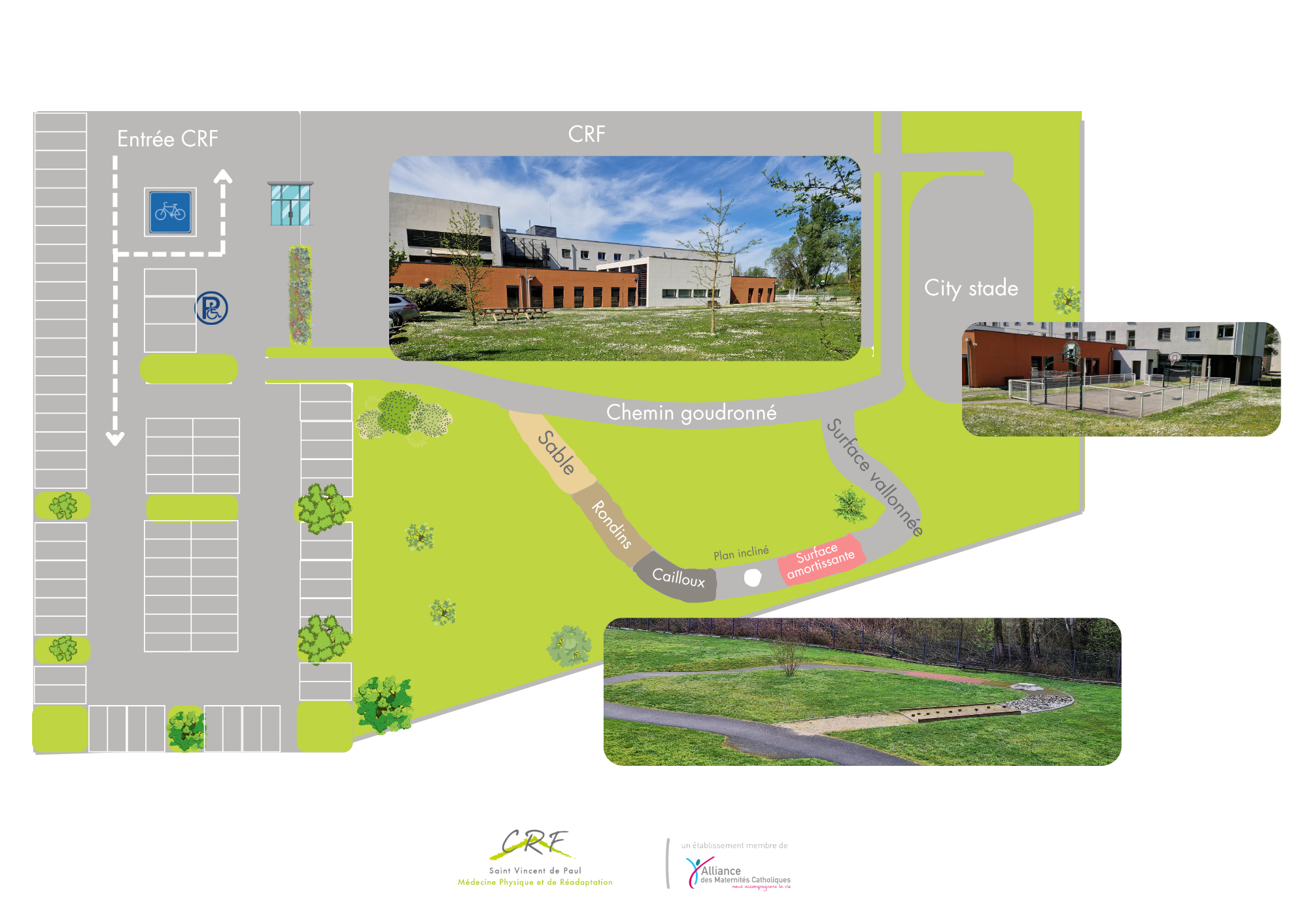 En complément des activités de rééducation pratiquées à l’intérieur du CRF, il est important que les patients hospitalisés puissent bénéficier d’un espace extérieur naturel et aménagé, dont les objectifs sont d’être :