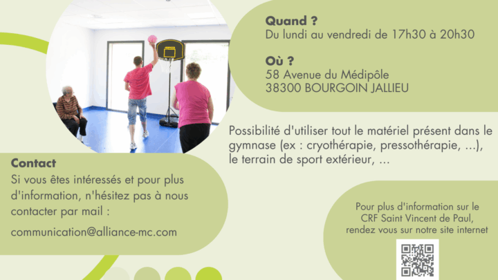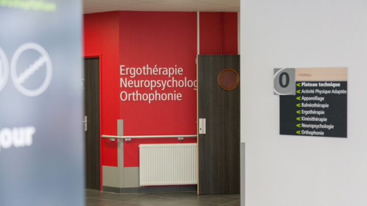 Le plateau de kinésithérapie propose des équipements variés permettant le traitement de la douleur, la reprogrammation neuromusculaire, la stimulation électrique fonctionnelle, ainsi que la rééducation de l’équilibre, de la marche et le réentraînement à l’effort. Il comprend notamment un dispositif d’analyse tridimensionnelle de la marche, une plateforme de posturologie, un rail de suspension pour la marche assistée, ainsi que du matériel de pouliethérapie, tapis, barres parallèles, appareils de mobilisation active et passive, boxes individuels et gymnase équipé. Un parcours extérieur fléché complète ce dispositif pour un travail en conditions réelles.